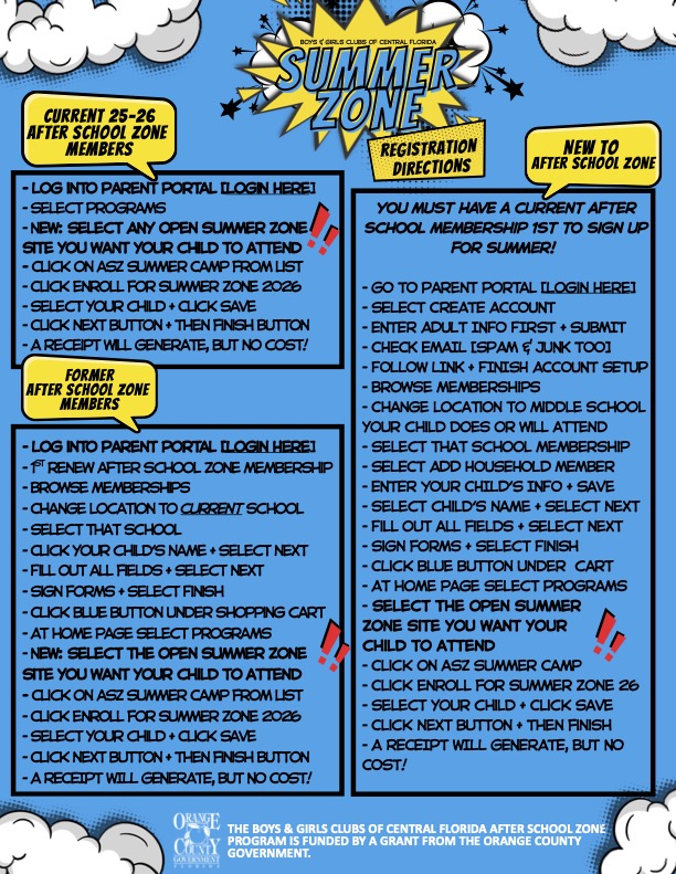 The Boys & Girls Clubs of Central Florida Summer Zone registration is now open for ALL Lockhart Middle students. Summer Zone is completely free, runs Monday-Thursday from 8:30-5:00 starting June 1st with meals, snacks, trips, and all activities included. Spots are limited & fill up quickly, so get registered ASAP to have a fun, safe place to go this Summer. We are hosting this summer, but you can be registered for any open Summer Zone site. Included is additional information and directions on how to register for both After School Zone (Step 1) & then Summer Zone (Step 2). Make sure to share this information with your parents. Registration begins April 1st, 2026! Please have your parent reach out to tfloyd@bgccf.org with any questions. We’re looking forward to an amazing Summer!